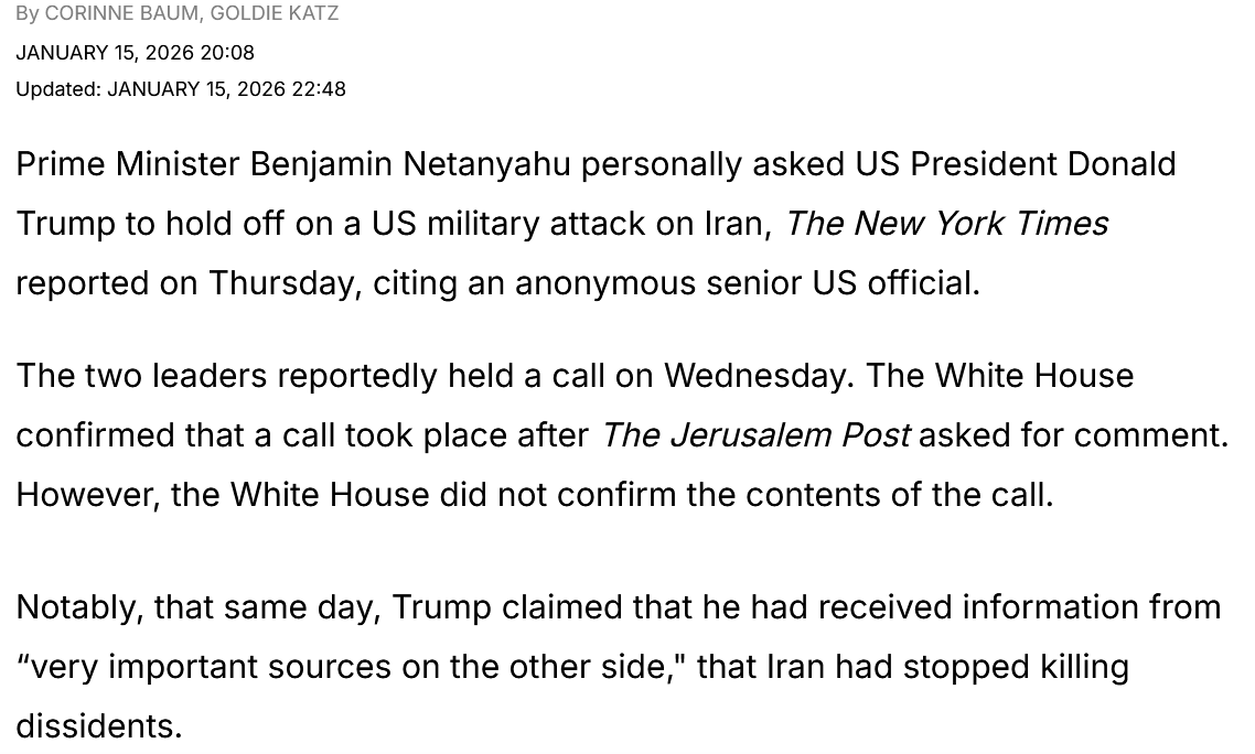 It is likely that the massive propaganda campaign on the demonstrations in Iran was about to push President Trump “over the edge” on Wednesday (a possible miscalculation from the CIA, MI6, and Mossad), forcing an intervention from Israeli PM Netanyahu. The actions of President Trump look to become more erratic by the day and bending the American global hegemony narrative pushed by the neocons.1 On this the attack against the PM of Norway, Jonas Gahr Støre, on the Nobel Peace Prize and Greenland today stands in testimony.