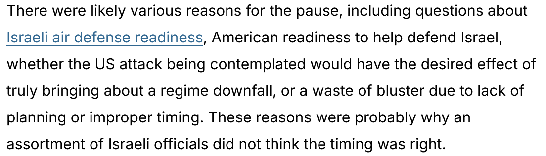 The news broke on Friday, when I was taking a day off from my entries here (as I noted to my paid subscribers on Thursday), but I only noticed this Sunday evening through another piece at the Jerusalem Post. It speculated on the risk that the Israeli missile defenses would not be ready for another onslaught by the Iranians. The piece is full of propaganda about the success of the IDF (Israeli Defense Forces) in destroying Iran’s missile launch capabilities and the damage inflicted on Iran’s nuclear program.